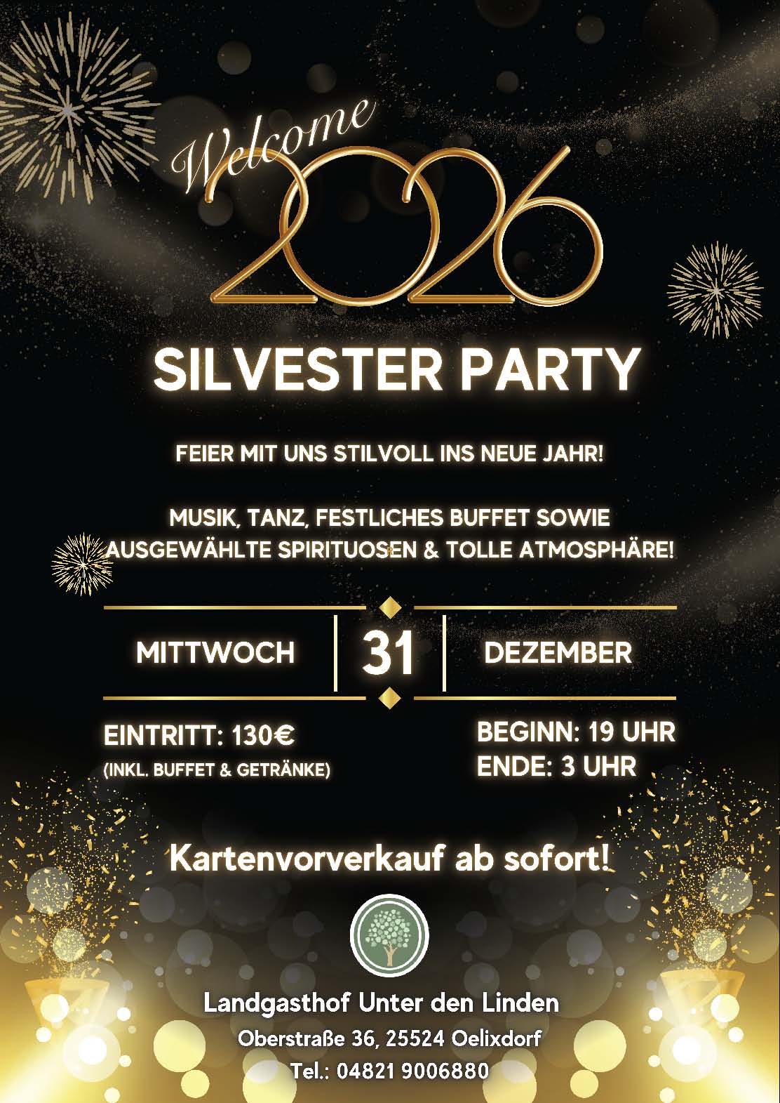wir laden euch herzlich ein, Silvester mit uns zu feiern! Am 31. Dezember ab 19 Uhr öffnen wir unsere Türen für eine unvergessliche Silvesterparty. Gemeinsam möchten wir das vergangene Jahr Revue passieren lassen und voller Vorfreude ins neue Jahr starten.